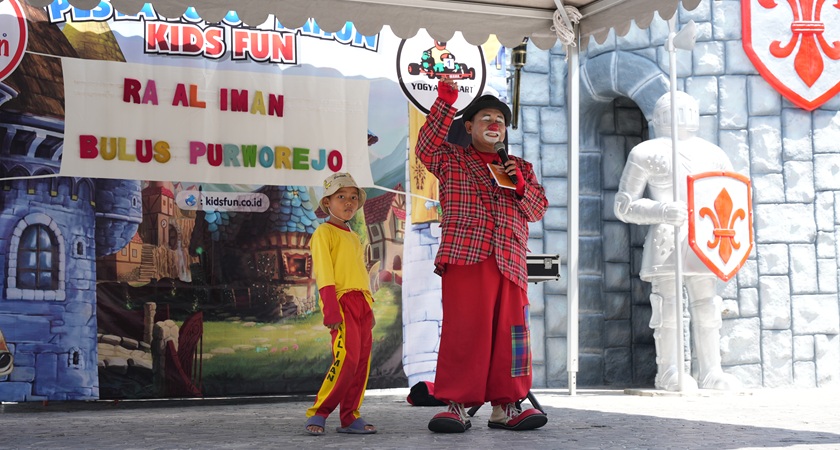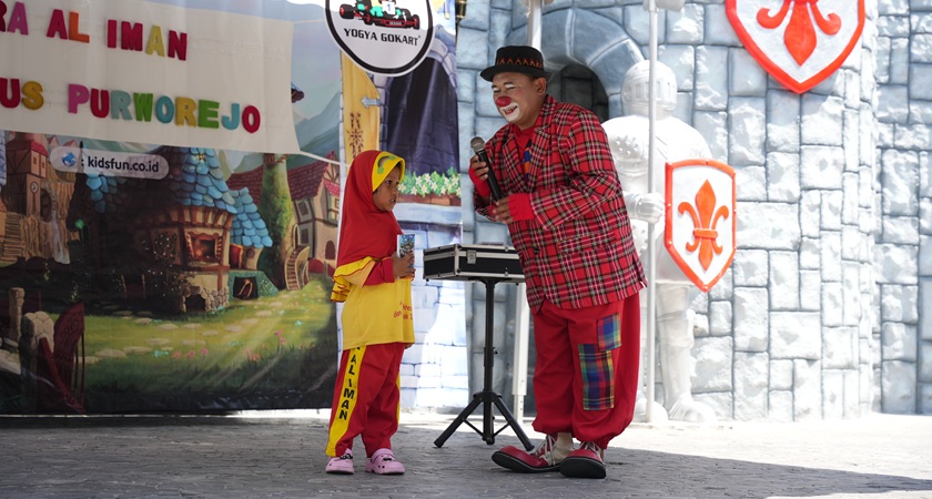 Selesai bermain di wahana, anak-anak dipandu untuk menyaksikan pertunjukan badut yang disediakan oleh pihak Kids Fun untuk para siswa RA Al-Iman.