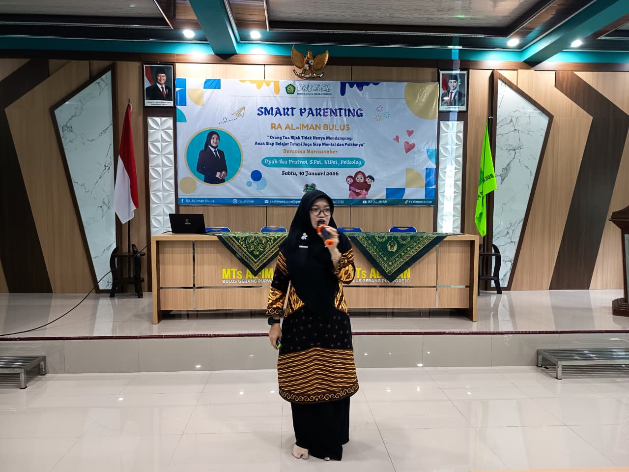 Purworejo, 10 Januari 2026 - RA Al-Iman Bulus mengadakan acara rutinan yaitu Smart Parenting. Tema acara kali ini adalah "Orang Tua Bijak Tidak Hanya Mendampingi Anak Siap Belajar Tetapi Juga Siap Mental dan Psikisnya". Acara ini mendatangkan narasumber yang memang memilki profesi sebagai psikolog yaitu Ibu Dyah Ika Pratiwi, S.Psi., M.Psi., Psikolog. Beliau juga merupakan Koordinator Bimbingan Konseling di MAN Purworejo.